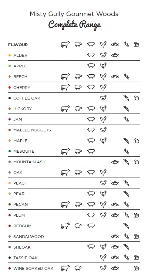 Misty Gully’s premium range of gourmet smoking woods are the largest in Australia. All of our wood chips for smoking are sourced from Australia and the USA’s finest providers of all-natural, chemical-free smoking woods.