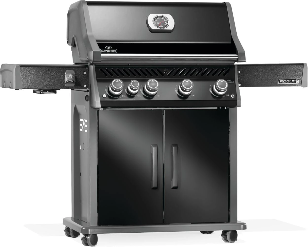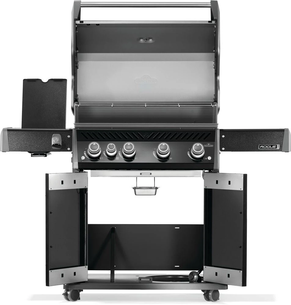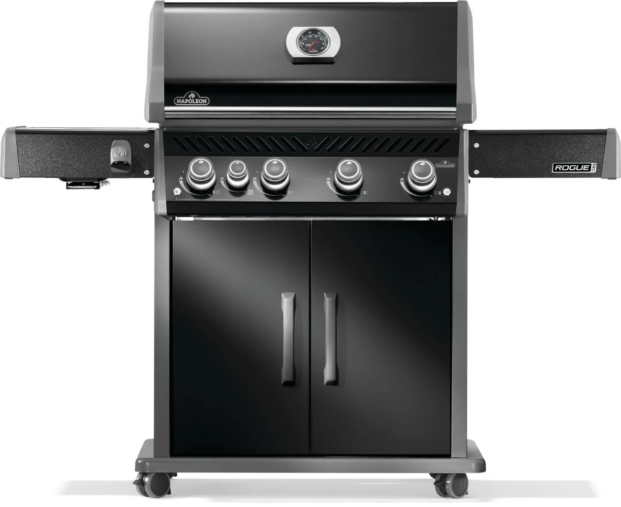 The Napoleon Rogue® 525 Propane Gas Grill with Infrared Side Burner in Black is a large and durable, easy to maintain gas grill. Featuring four main burners, stainless steel sear plates, stainless steel cooking grids with a reversible cast iron griddle and a high top lid, this grill has everything you need for gourmet meals. Sear restaurant-style steaks on the integrated sizzle zone side burner while the generous side shelf provides plenty of prep space.