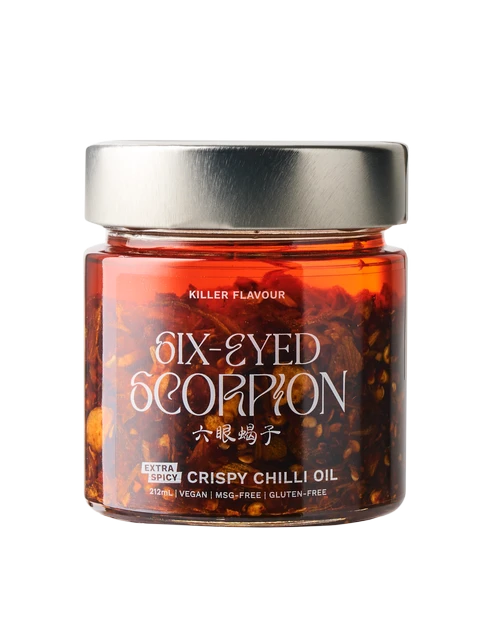 Six-Eyed Scorpion’s Extra Spicy Crispy Chilli Oil adds depth-of-flavour to any dish.