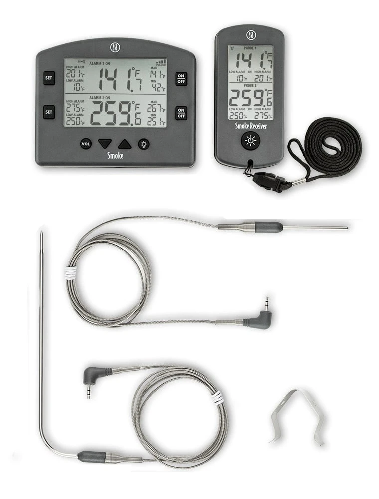 Smoke includes base unit, Pro-Series® High Temp Cooking Probe, Pro-Series High Temp Air Probe & Grate Clip, Wireless Smoke Receiver w/Lanyard, and Operating Instructions.